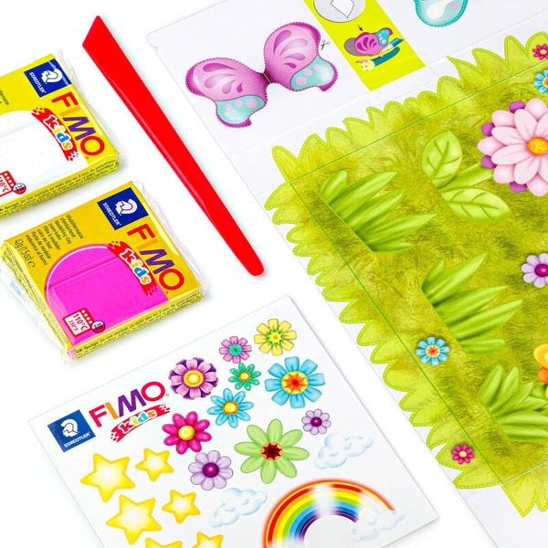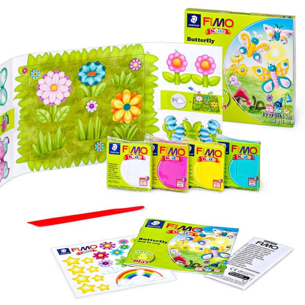 Set "Butterfly“ mit 4 Blöcken à 42 g (gelb, rosa, türkis, glitter weiß), Modellierstab, Schritt-für-Schritt-Anleitung, Spieluntergrund / Bastelbogen, Aufkleber, Gebrauchsanleitung