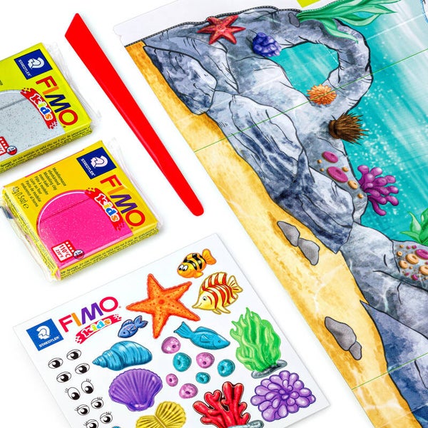 Set "Mermaid“ mit 4 Blöcken à 42 g (türkis, blassrosa, glitter silber, glitter pink), Modellierstab, Schritt-für-Schritt-Anleitung, Spieluntergrund / Bastelbogen, Aufkleber, Gebrauchsanleitung