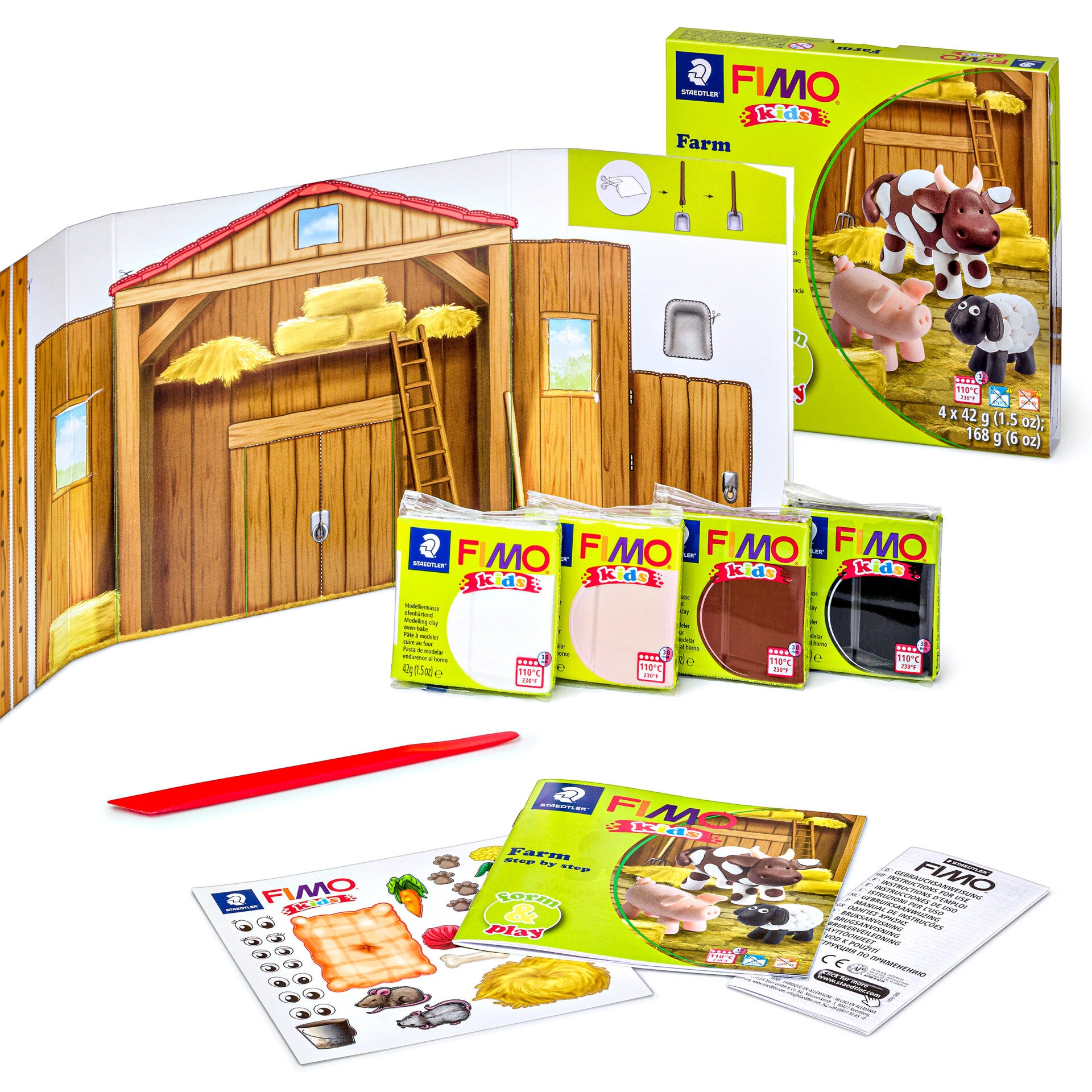 Set 'Farm“ mit 4 Blöcken à 42 g (weiß, blassrosa, braun, schwarz), Modellierstab, Schritt-für-Schritt-Anleitung, Spieluntergrund / Bastelbogen, Aufkleber, Gebrauchsanleitung