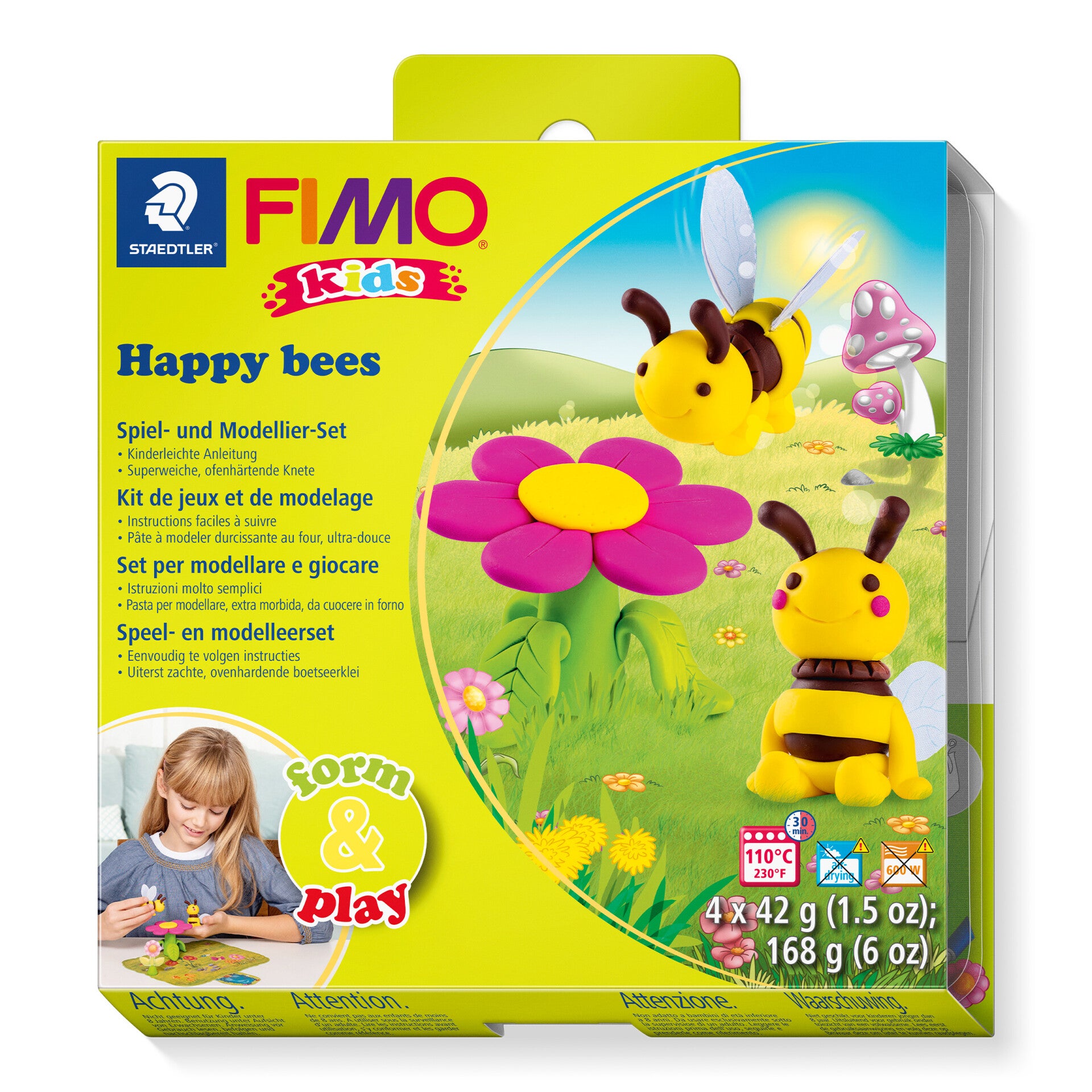 Set „Happy Bees“ mit 4 Blöcken à 42 g (gelb, hellgrün, pink, braun), Modellierstab, Schritt-für-Schritt-Anleitung, Spieluntergrund / Bastelbogen, Aufkleber, Gebrauchsanleitung