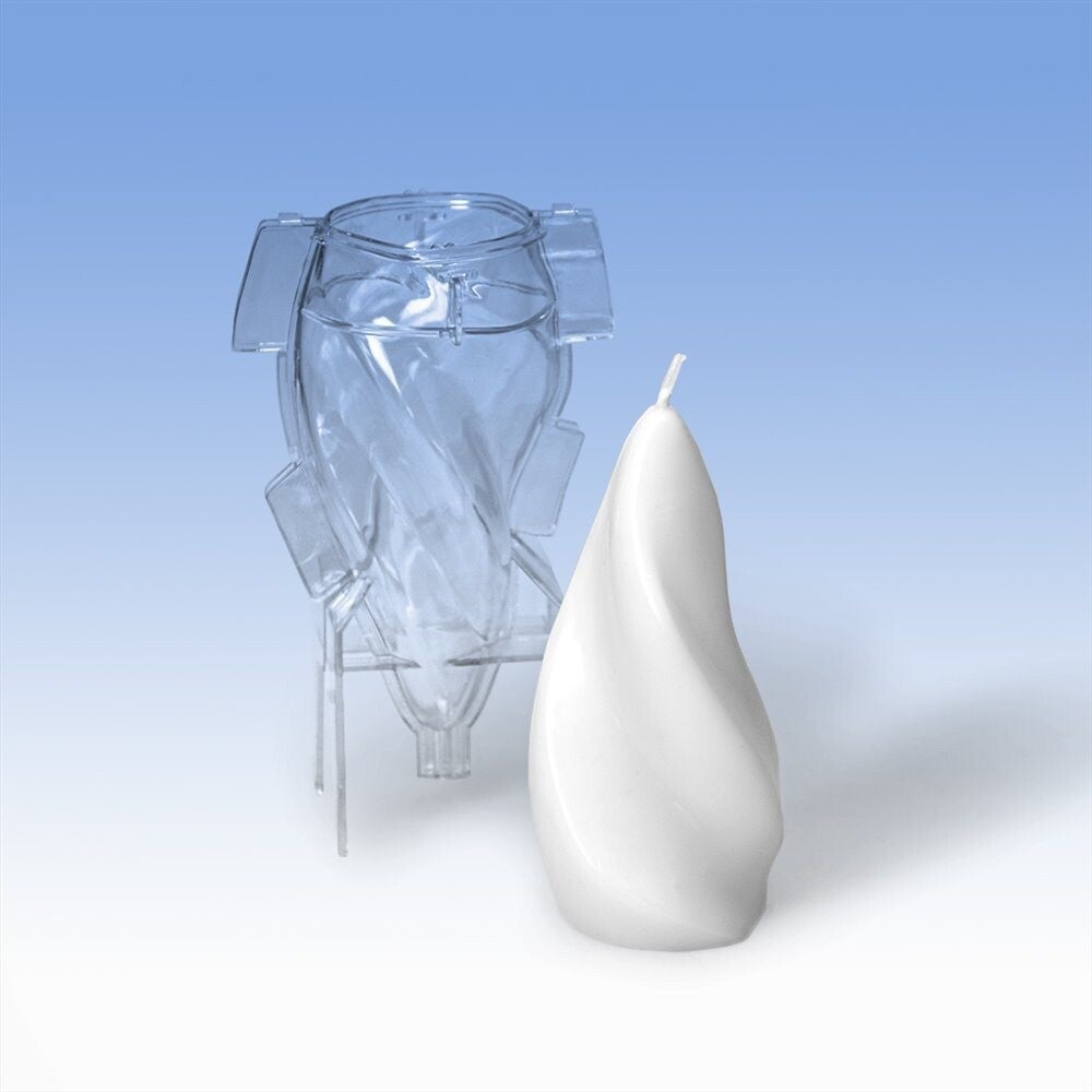 Polycarbonat, transparent. Zum Giessen von Paraffin- und Paraffin/Stearin-Kerzen (hitzebeständig bis 120°C). Der angegebene Flachdocht bezieht sich auf Paraffin- und Paraffin/Stearin-Wachs.